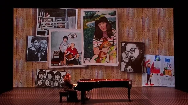 The Alcotts is a breath of tenderness. It takes place out of time in the golden light of memory. My parents and my infant self are pulled from the outer panels of the triptych into the center until we are seated together behind the piano, watching me play. Images of family appear and disappear. I am caught in the past while making music in the present.