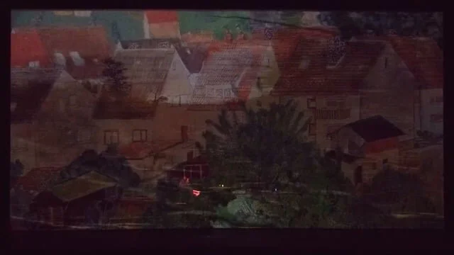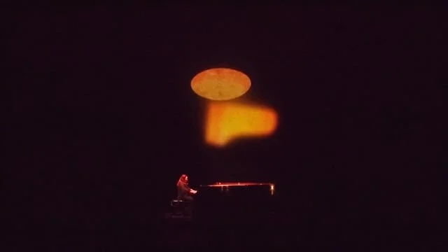 Thoreau emerges at dawn with the sounds of birds bringing us out of the darkness. We travel through the landscape of the triptych, and gradually pull back until the entire painting finally emerges across the width of the stage. The central icon, the copper engraving plate, grows and lifts out of the painting, as the golden harp of the piano rises out of the instrument. The two fuse and expand until I have been immersed by the garden depicted in the copper plate. I step out of myself and walk through the garden. The camera pulls in, closer and closer, until we are left with the image of my eye.